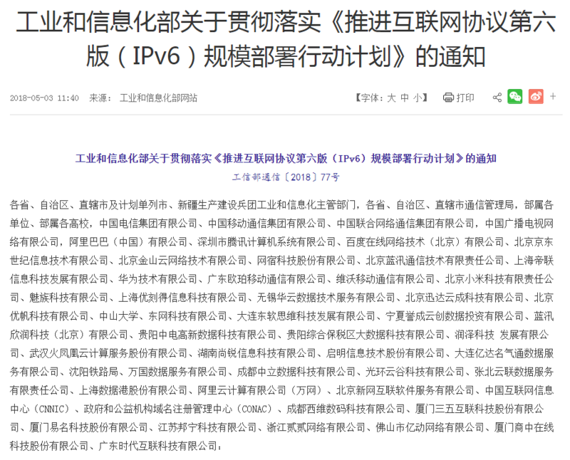 根據(jù)中辦、國辦下發(fā)的《行動計(jì)劃》和工信部下發(fā)的《通知》:2018年末,省級政府網(wǎng)站,央企網(wǎng)站和新聞媒體網(wǎng)站全部改造支持IPv6;2020年末,市級政府和新聞媒體和工業(yè)互聯(lián)網(wǎng)應(yīng)用支持IPv6。...