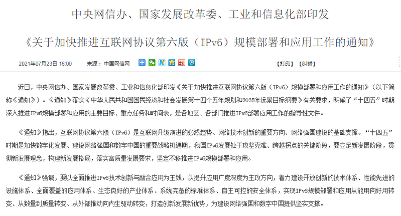 近日,中央網(wǎng)信辦、國家發(fā)展改革委、工業(yè)和信息化部印發(fā)《關(guān)于加快推進(jìn)互聯(lián)網(wǎng)協(xié)議第六版(IPv6)規(guī)模部署和應(yīng)用工作的通知》(以下簡稱《通知》)。《通知》落實(shí)《中華人民共和國國民經(jīng)濟(jì)和社會發(fā)展第十四個五年規(guī)劃和2035年遠(yuǎn)景目標(biāo)綱要》有關(guān)要求,明確了“十四五”時期深入推進(jìn)IPv6規(guī)模部署和應(yīng)用的主要目標(biāo)、重點(diǎn)任務(wù)和時間表,是各地區(qū)、各部門推進(jìn)IPv6部署應(yīng)用工作的指導(dǎo)性文件。《通知》指出,互聯(lián)網(wǎng)協(xié)議第...
