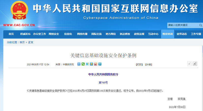 中華人民共和國國務(wù)院令第745號《關(guān)鍵信息基礎(chǔ)設(shè)施安全保護(hù)條例》已經(jīng)2021年4月27日國務(wù)院第133次常務(wù)會議通過,現(xiàn)予公布,自2021年9月1日起施行。總理 李克強(qiáng)2021年7月30日關(guān)鍵信息基礎(chǔ)設(shè)施安全保護(hù)條例第一章 總 則第一條 為了保障關(guān)鍵信息基礎(chǔ)設(shè)施安全,維護(hù)網(wǎng)絡(luò)安全,根據(jù)《中華人民共和國網(wǎng)絡(luò)安全法》,制定本條例。第二條 本條例所稱關(guān)鍵信息基礎(chǔ)設(shè)施,是指公共通信和信息服務(wù)、能源、交...